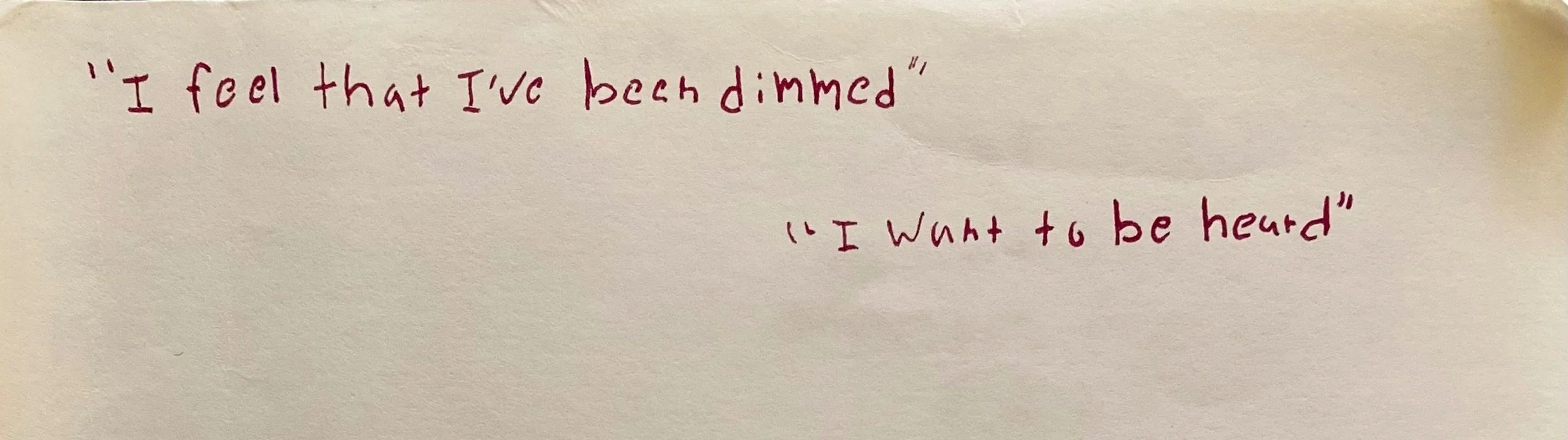 “Look down at your hands, do they look old or faded? Young and spritely? Do they feel different than they look? Do you feel many moons younger? Do you recall your sight at your youngest moment? Can you see your mother’s first glance of you and the nursery of pink and blue wallpaper? Can you see the flame of your first birthday candles? Can you see that big yellow bus that stripped away your sibling’s soul? Do you remember how it looked different when it came for you? Could you see your creativity fade? Probably not. Do you remember the look on your mother’s face when you got your first A? Or your dad’s when you got your first D? Were your parents in the picture at all? Was the only sight you had of your mother in her tummy? I'm so sorry. Really put yourself back to your youthful sight! Was the world all in colors, did it all look brighter? I know it’s harder now, but can you try and keep that pigmentation firing off?